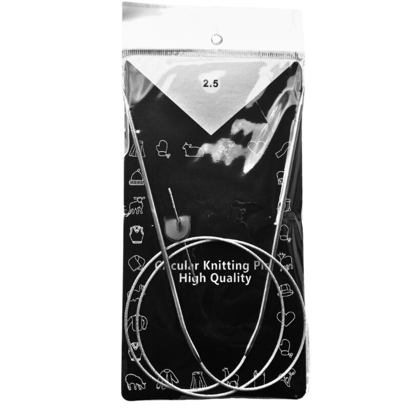 Aguja circular de 80 cm de largo con cable flexible, perfecta para tejer proyectos grandes como mantas, chales o prendas sin costuras. Su diseño ergonómico permite trabajar con comodidad durante largas sesiones y evitar enredos. Disponible en 13 tamaños diferentes y en paquetes por 10 unidades del mismo número.