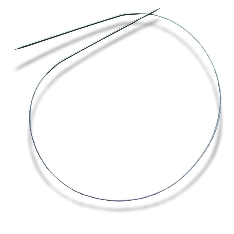 Aguja circular de 80 cm de largo con cable flexible, perfecta para tejer proyectos grandes como mantas, chales o prendas sin costuras. Su diseño ergonómico permite trabajar con comodidad durante largas sesiones y evitar enredos. Disponible en 13 tamaños diferentes y en paquetes por 10 unidades del mismo número.