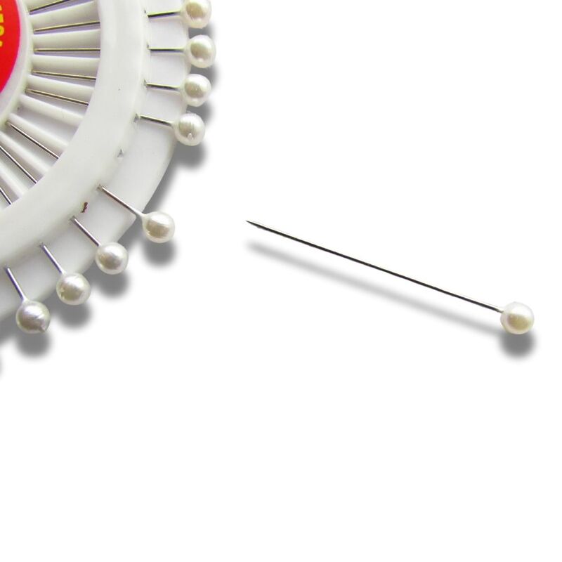 Alfileres de 38 mm con cabeza tipo perla en color blanco o colores surtidos, ideales para costura, confección y manualidades. Presentación en rueda plástica de 40 unidades. Caja con 144 ruedas.