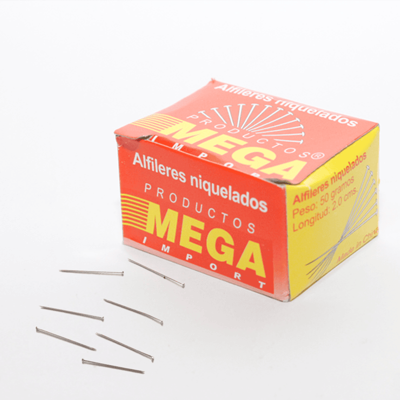 Alfileres niquelados de alta calidad, resistentes y de fácil manejo, ideales para costura, confección y uso general. Disponibles en distintas medidas, Presentacion en paquete por 10 cajas por 50gr c/u.