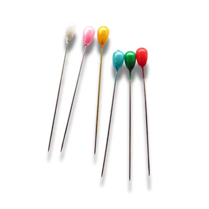Alfileres de 55 mm con cabeza perlada en forma de lágrima, en colores surtidos. Resistentes y decorativos, ideales para costura y manualidades. Encuentralos en presentacion de caja por 12 gruesas.