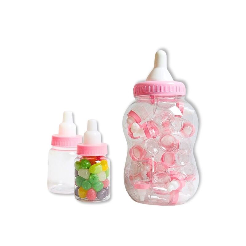 Este hermoso biberon, viene en un recipiente transparente grande alrededor de unos 30 cm de altura en donde contiene una tapa de color azul o rosado, en su interior viene lleno de 30 biberones mas pequeños, ideal para aquellos que buscan más producto y mas rentabilidad al adquirir dos tipos de articulos diferentes, es especial ya que este hermoso articulo se puede prestar para cualquier tipo de recordatorio o decoracion en las fiestas de babu shower o revleaciones de genero.