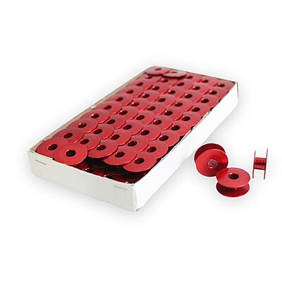 Carretel de aluminio sólido, sin huecos, en color rojo. Diseñado para máquinas planas industriales, tanto mecánicas como electrónicas. Alta resistencia y flujo de hilo uniforme. Disponible también en rojo, verde y amarillo.