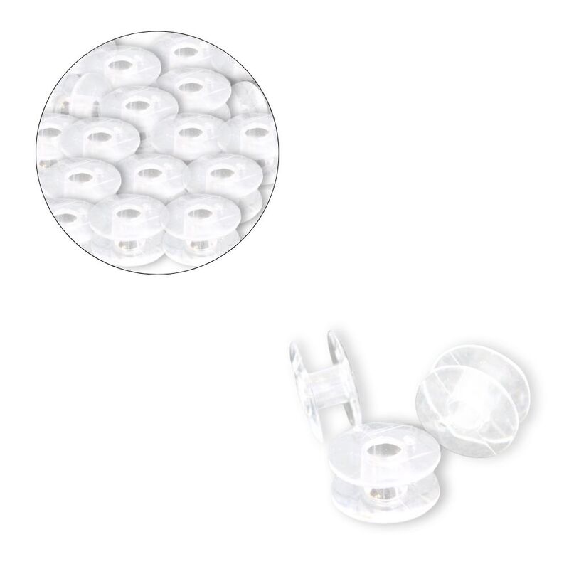 Carretel compacto y funcional para máquinas industriales y algunos modelos familiares. Su diseño bajo permite un devanado preciso y sin complicaciones. Fabricado en plástico resistente. Disponible en azul y transparente. Paquete con 200 unidades.