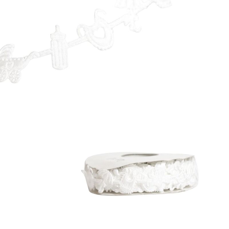 Cinta doble razo blanca de 2 cm de ancho con figuras en relieve como tetero, osito, babero y coche, dispuestas en línea. Ideal para decoración de baby shower, regalos y manualidades. Rollo x 10 yardas.