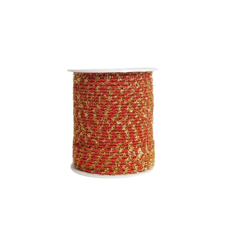 Cordón Lurex Guirnalda rojo con destellos dorados. Rollo de 72 yardas, ideal para decoración navideña y manualidades creativas.