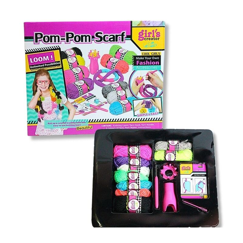 Kit para manualidades MBK-282 para crear bufandas con pompón. Incluye telar circular, agujas y 9 madejas de lana. Ideal para aprender y divertirse tejiendo. Este set completo está diseñado especialmente para elaborar bufandas con pompón, un proyecto ideal tanto para principiantes