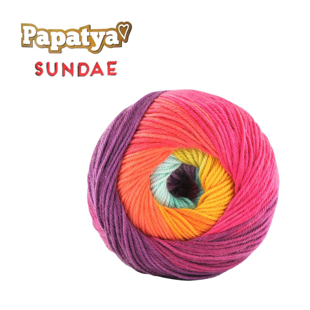 La lana Papatya Sundae es un hilo hecho de 100% microfibra acrílica, que se destaca por su textura suave y sedosa, muy similar al algodón mercerizado. Este hilo ha sido diseñado pensando en la comodidad y la belleza visual: sus transiciones de color son delicadas pero definidas, creando franjas perfectas que añaden elegancia a cualquier prenda o accesorio sin necesidad de cambiar de ovillo. Encuéntrala en 12 colores, en paquetes por 5 ovillos.