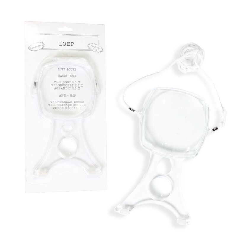 Gracias a su cordón ajustable, la lupa se posiciona cómodamente alrededor del cuello, permitiendo que el lente quede justo donde lo necesitas para trabajar sin esfuerzo. Esta versión es transparente y sin iluminación integrada, ideal para espacios bien iluminados o para quienes buscan una solución más sencilla y liviana.