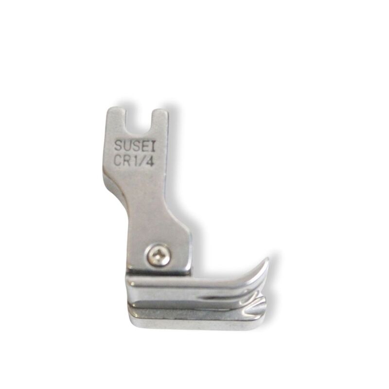 Es un prensatelas robusto y preciso, diseñado para realizar costuras rectas a 1/4 de pulgada del borde de la tela. Su diseño desplazado hacia la derecha permite mantener una distancia constante y exacta entre la aguja y el borde del material, ideal para trabajos de alta exigencia en confección industrial.
