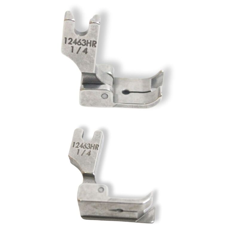 El pie guía derecho HR 1/4 industrial permite costuras precisas a 1/4" del borde. Ideal para trabajos con margen ancho, pespuntes visibles y acabados consistentes en máquinas industriales.
