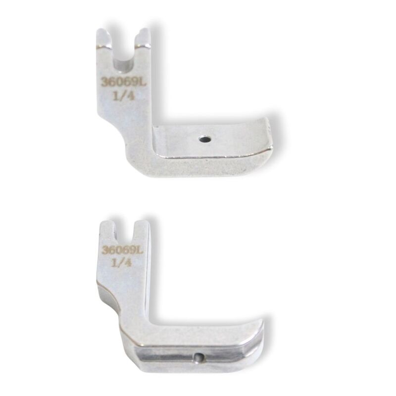 El pie industrial Enbone 36069L 1/4 permite aplicar sesgo o ribetes con precisión. Ideal para unir bordes con limpieza y uniformidad en máquinas industriales.