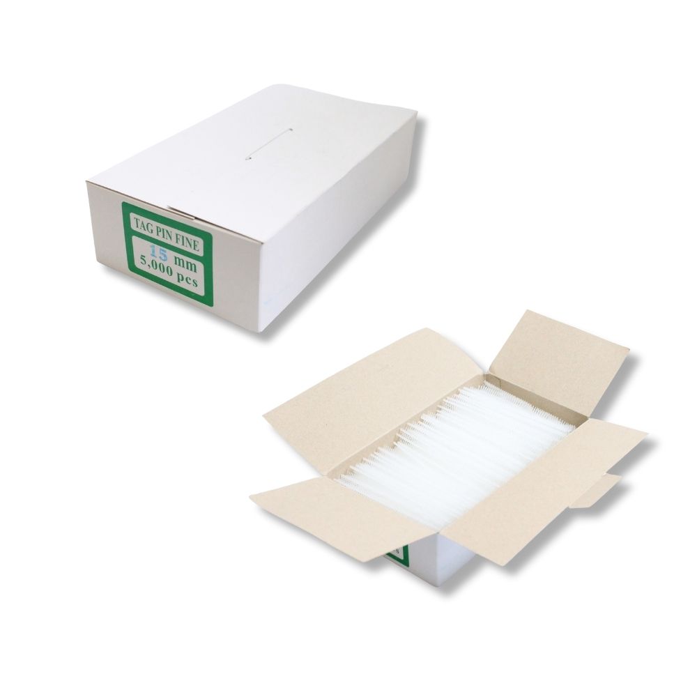 Plastiflechas de 15 mm para tiqueteadora. Caja con 5.000 unidades, ideales para sujetar etiquetas de forma segura y profesional en prendas y productos textiles.