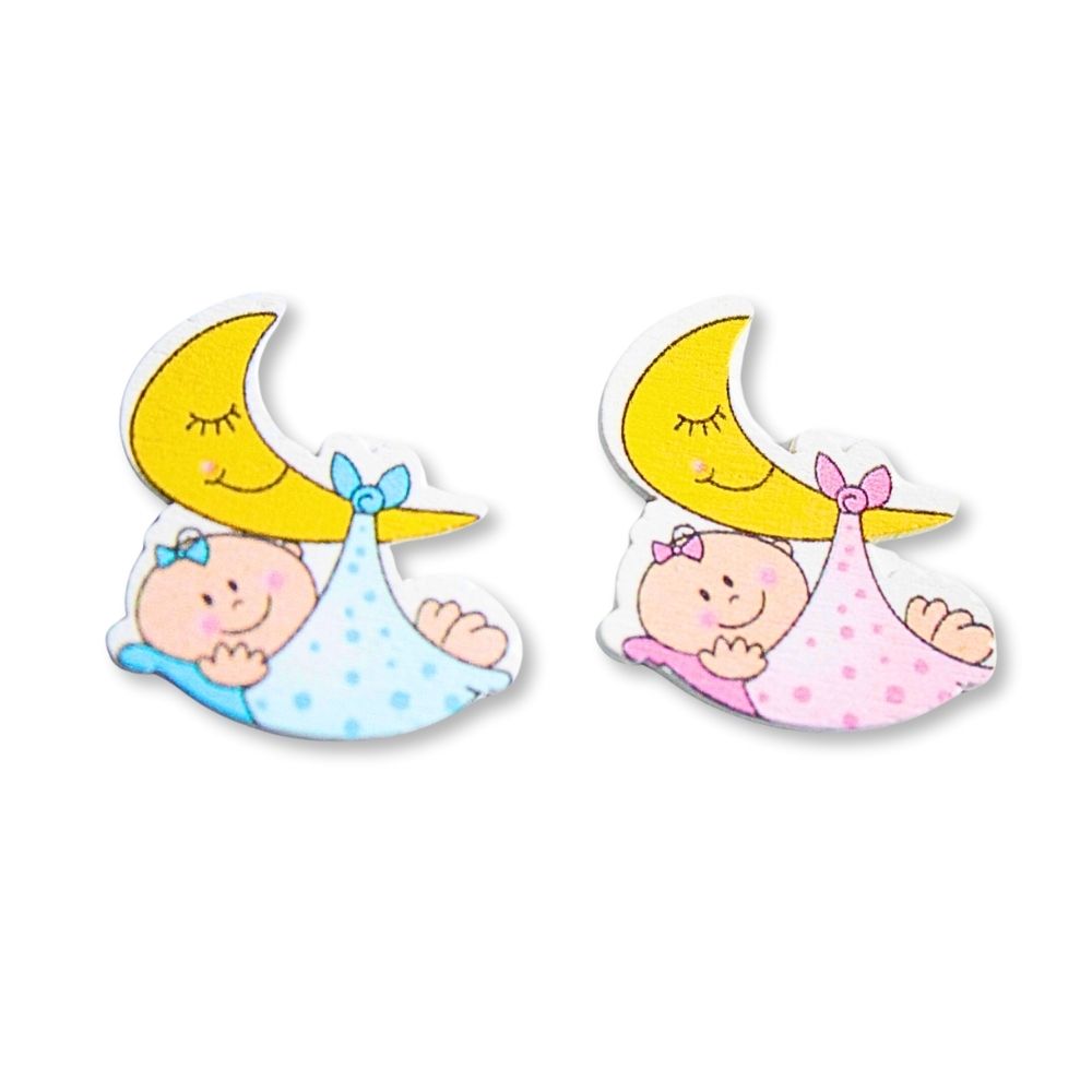 Recordatorio de madera en paquete por 100 unidades, disponible en color rosa o azul. Perfecto para eventos, bautizos, baby showers o celebraciones especiales. Elaborado en madera liviana y resistente, con un diseño delicado y versátil para personalizar.